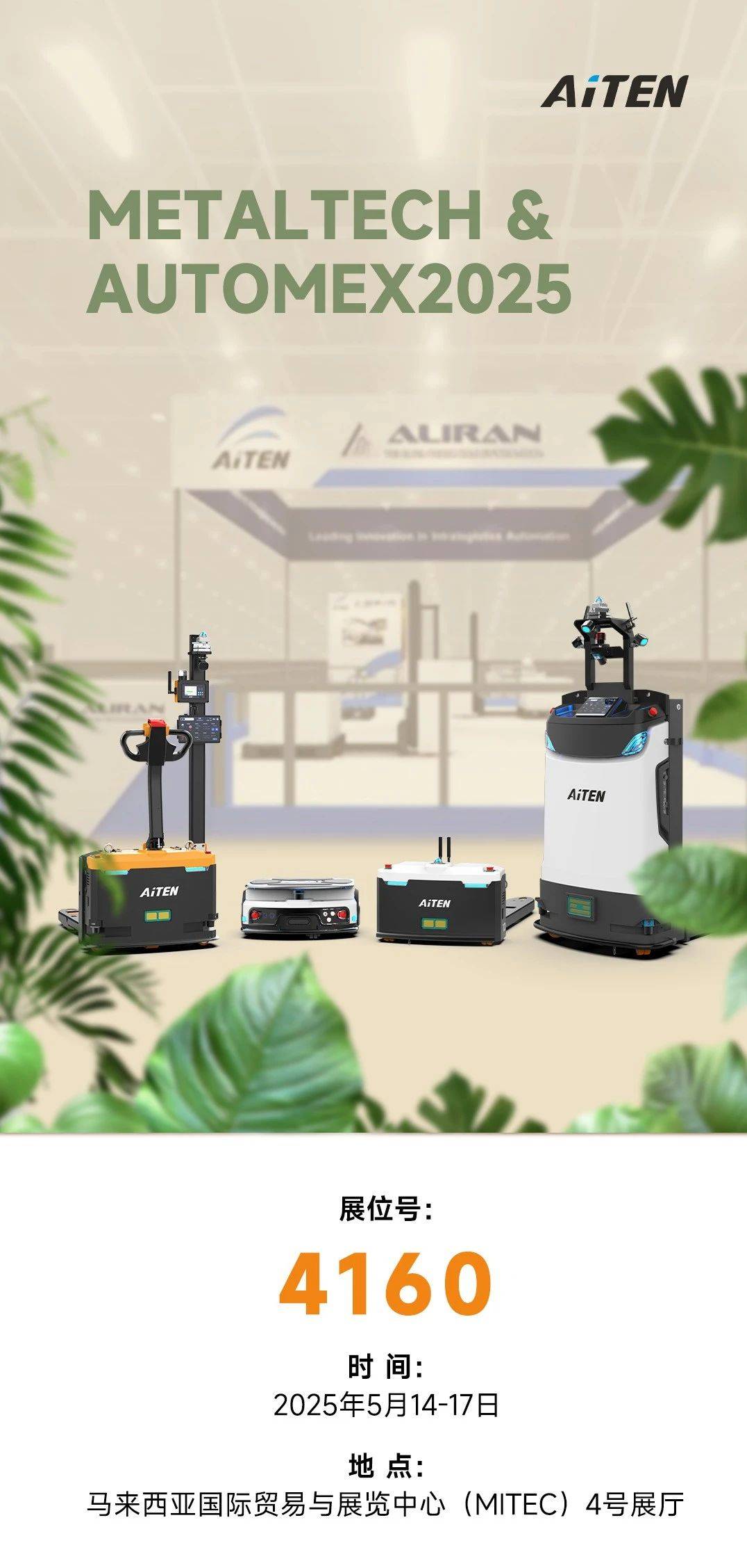 倒计时启动!诚邀您参与现场动态演示,333tiyuAiTEN将携搬运移动机器人AM15,MP10,APE15,TT15惊艳亮相(2025.5.14-17)。